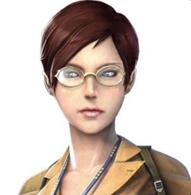 A short red-haired female that wears a pair of glasses. She appears to be around under 30 years old.