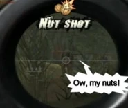 A Nut Shot is a humorous Achievement added onto Combat Arms, possibly as a April Fool's joke, added after the 3-25-09 Patch. When a player shoots another player (must be a male Mercenary or Base Character) in the groin area, they will achieve a "Nut Shot".