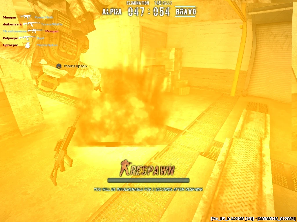 A Spawn Camper is one who camps where players spawn, at either the Alpha or Bravo spawn point, and kills the opposing players before they have a chance to respond. A player respawns within three seconds of invincibility after each death, but this can be easily counteracted by the camper by simply waiting in a hidden spot away from the view of the enemy.