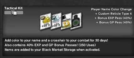 The Tactical Kit is a Package Deal containing several items for 30 days. These items are;
