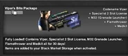 | “ | Fully Loaded! Contains Viper, Specialist 2 Slot License, M32 Grenade Launcher, Flamethrower and Medkit all for 30 days! Items are added to your Black Market Storage when activated. | ” |